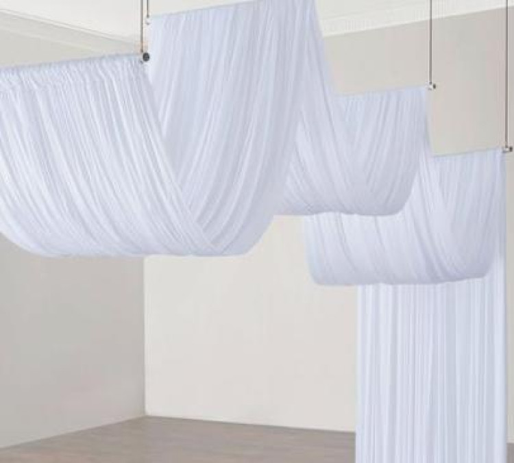 A 5' x 30' White Ceiling Drape with a pole pocket on each end, is a long, flowing fabric panel that hangs overhead to create a clean, elegant look. It’s great for hiding ceiling fixtures, softening harsh lighting, and adding a smooth, airy vibe across ballrooms, gyms, or tents. Use it to swag, stretch, or layer with other drapes for weddings, proms, or any event that needs a polished finish.